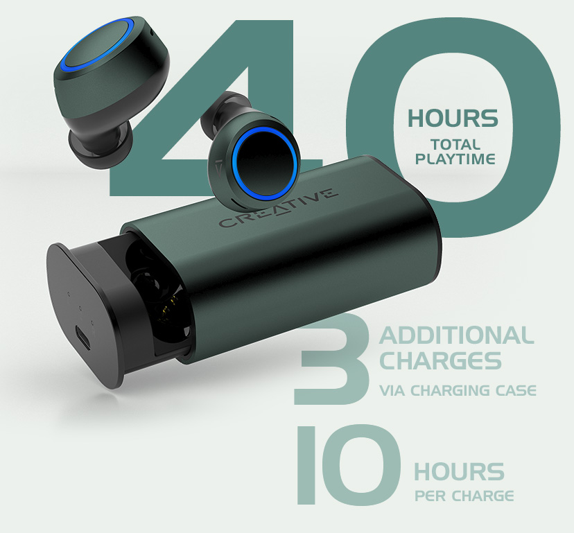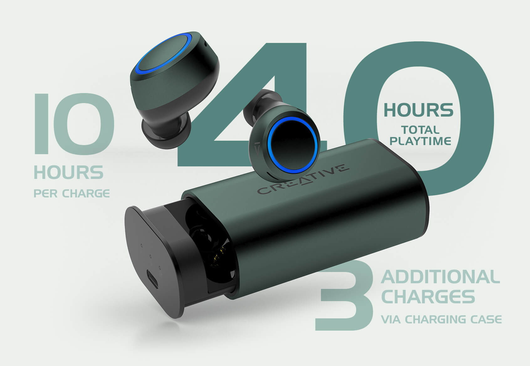 Boosted to power up to 40 hours of total playtime with 10 hours of battery life per charge, Creative Outlier Air V3 tops the series in its battery performance. We've raised the stakes with our newest Noise Control features, customizable touch control buttons, and quad mics for calls clarity, all engineered for the best true wireless experience.