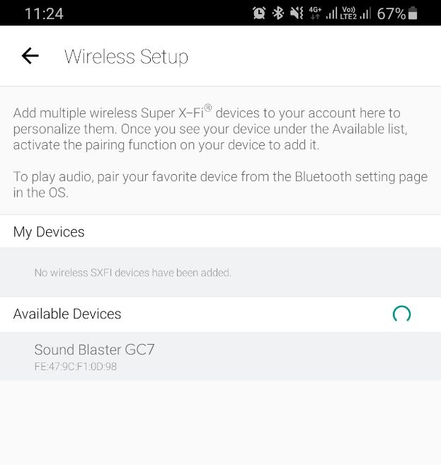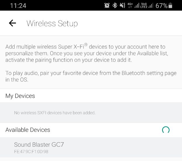 On the SXFI App, go to ‘Wireless Setup' and select Sound Blaster GC7 under ‘Available Devices'.