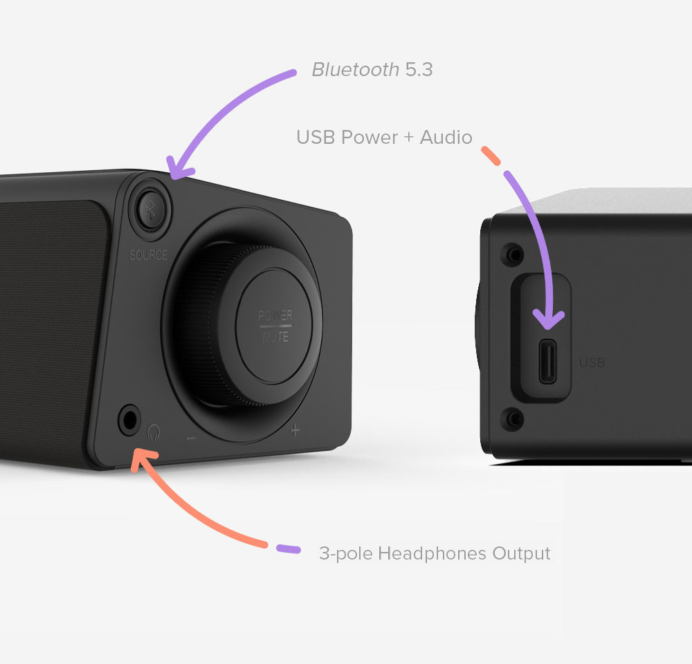 The Creative Stage SE mini is powered via USB-C and supports Bluetooth 5.3. Simply connect the soundbar to a supported device, and you're ready to go!
